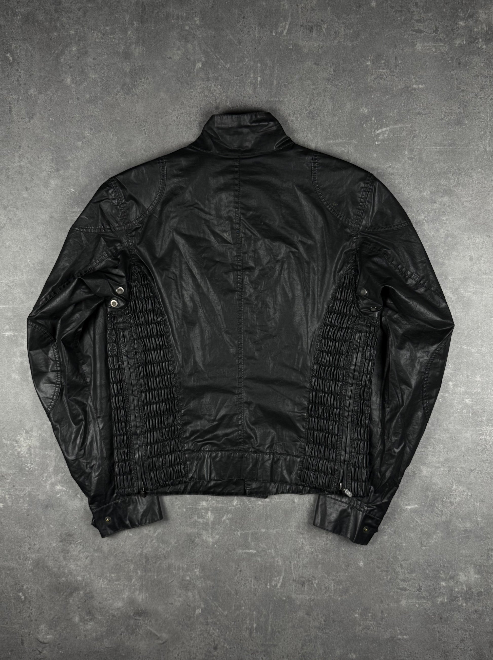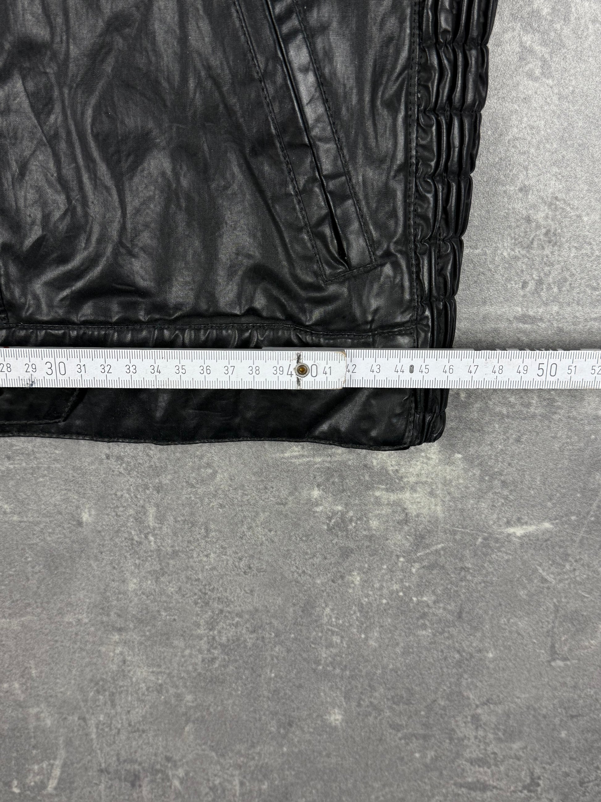 Details: custom Zipper, waxed Look, gerippte Stretch-Lederpaneeles, Achselbelüftung, Metalpatches